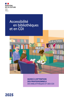 Fruit d’une réflexion collective inédite entre professionnels des bibliothèques et de la documentation, le guide Accessibilité en bibliothèques et en CDI à l’attention des professionnels des bibliothèques et des CDI aborde tous les domaines d’activité de ces établissements, de l’accueil des personnes en situation de handicap jusqu’aux collections et aux services, des projets de service à l’accessibilité des sites internet et des documents numériques, de l’aménagement intérieur des espaces à la communication en direction des usagers et des partenaires.